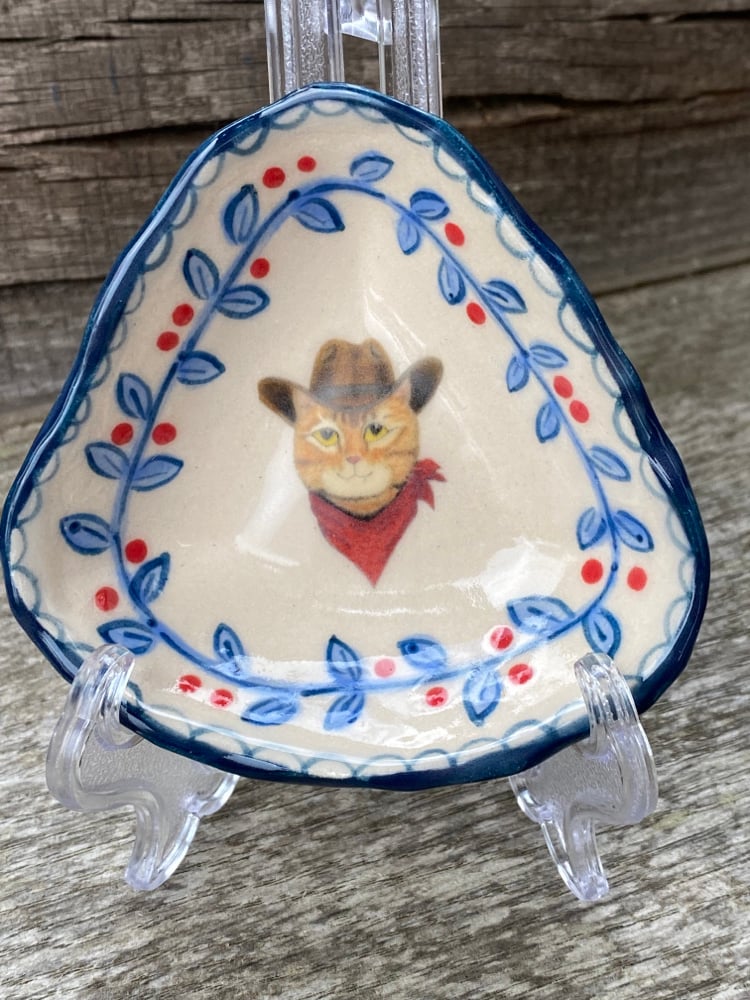 The cats have all been drawn by myself and then digitally resized as a waterslide decal to fit onto a dish. The decal goes onto the 3rd firing after all the decoration has been done.