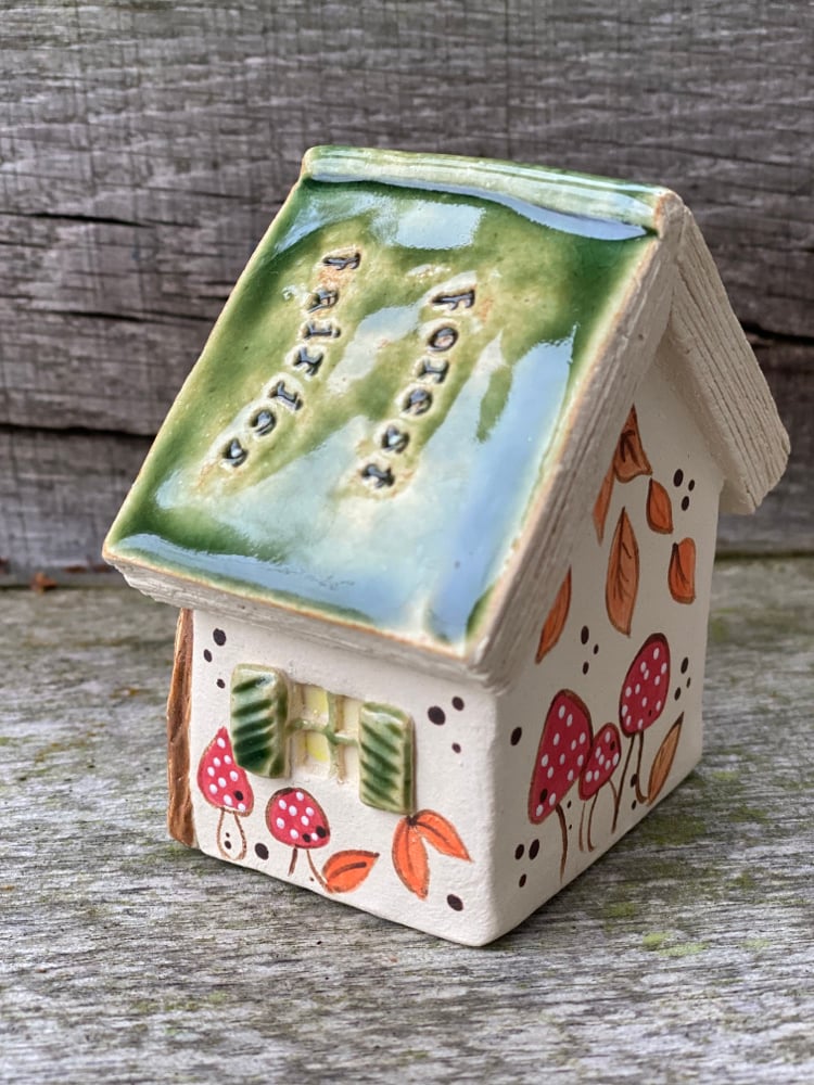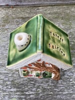 My adorable ceramic fairy house is a whimsical piece of art to adorn a shelf. The roof is designed as if it was an open book with the title "Forest Fairies".